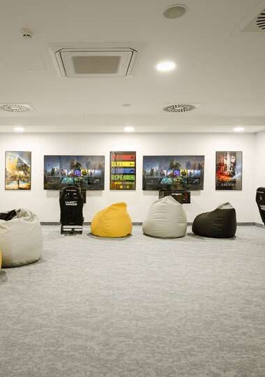 Game Room: sala multimedialna z dostępem do konsol XBOX oraz PS5 z szerokim wyborem gier, dostępna przez całą dobę